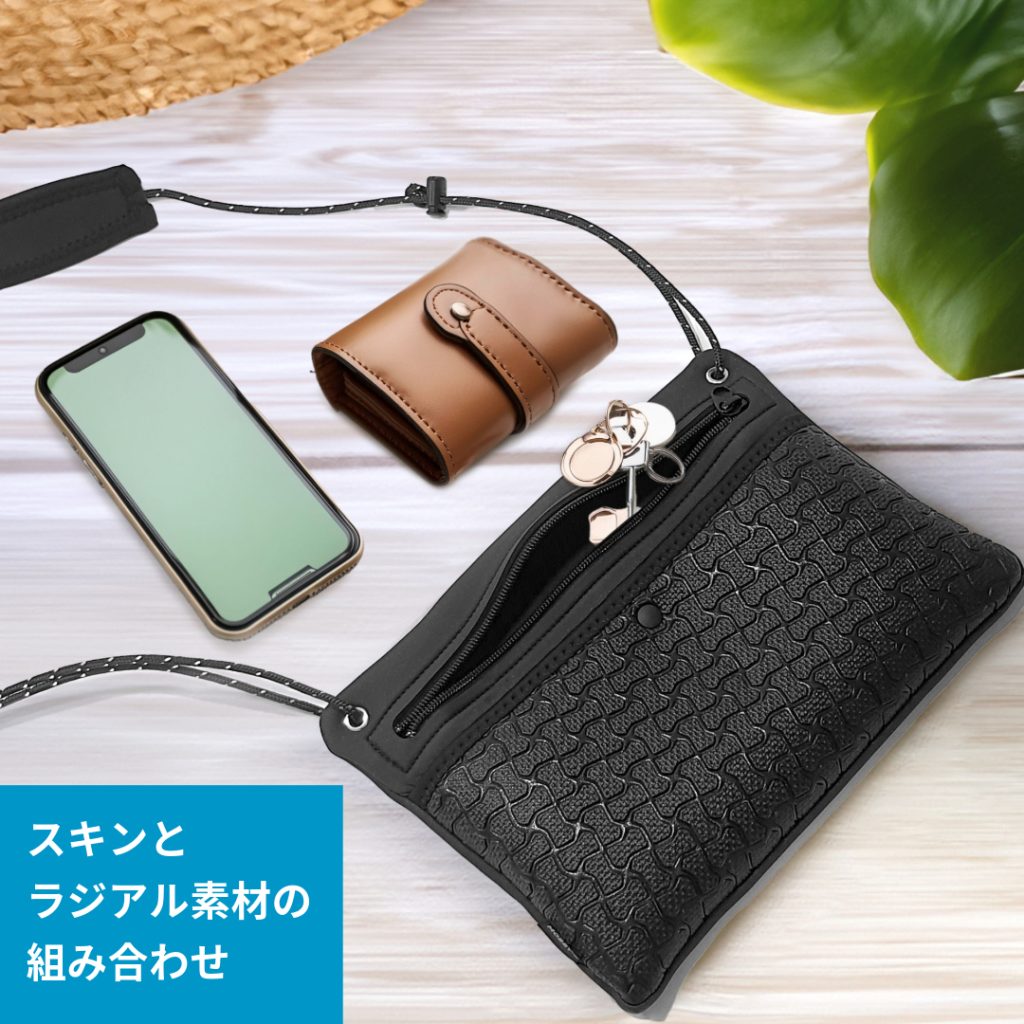 ウェットスーツにも使う素材なので、多少の水濡れはOKです。紐部分にはパラコードを使用しており、長さの調整が可能です。