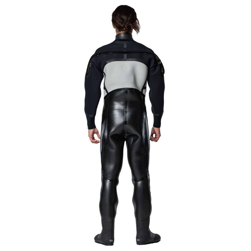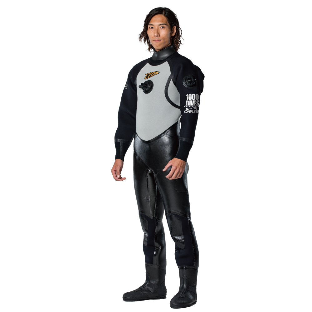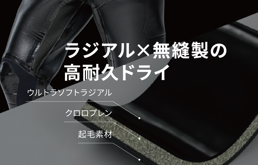 ラジアルとジャージをバランスよく配置し、重くなりすぎないドライスーツに仕上げています。